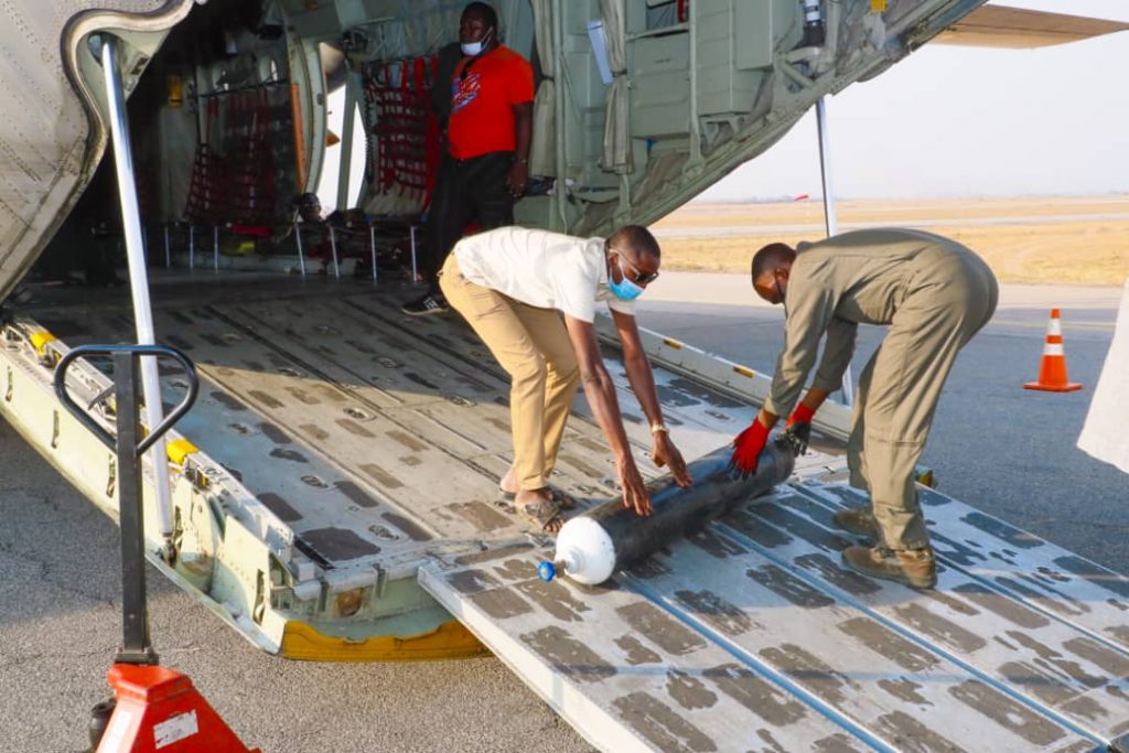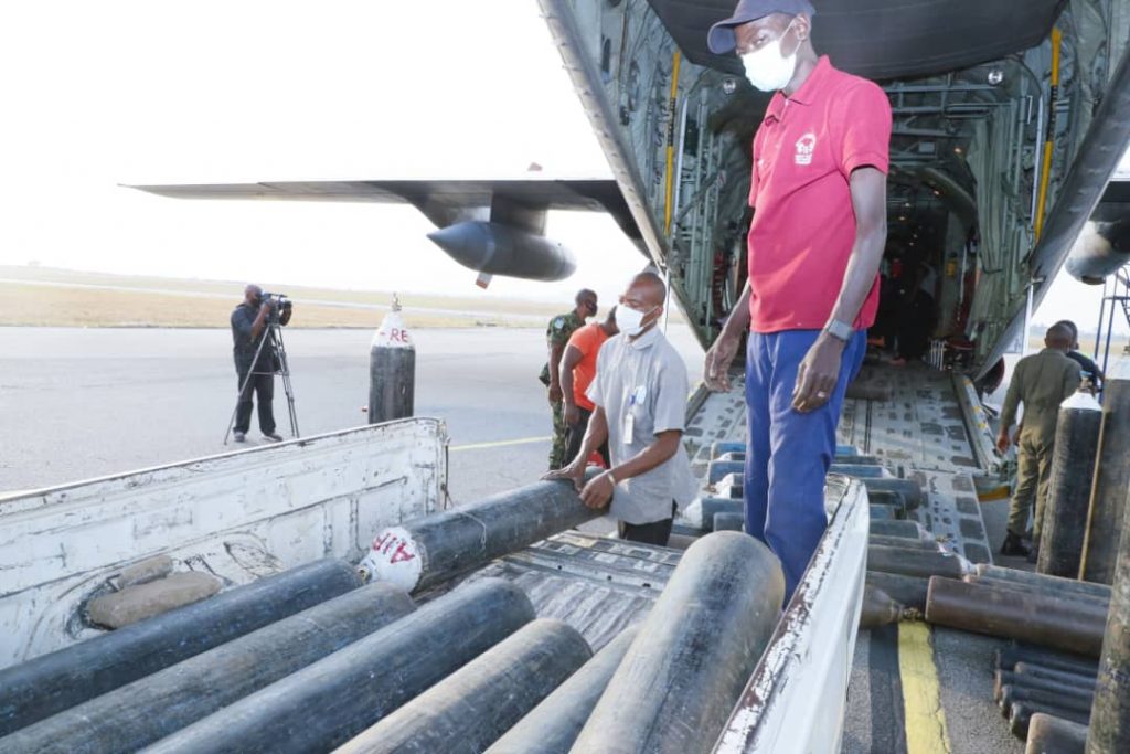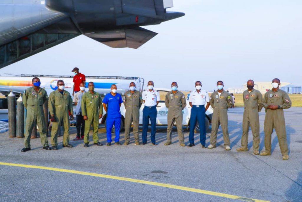 The oxygen, which was produced by the NAF LOX Plant at the 103 Strike Group (103 STG) Yola, were airlifted by the NAF C-130 Hercules aircraft to the Nnmadi Azikiwe International Airport, Abuja and handed over to the beneficiaries by the Chief of Medical Services (CMS), Air Commodore Gideon Bako, who was represented by the Commander 063 NAF Hospital Abuja, Group Captain Muzzammil Muhammed.