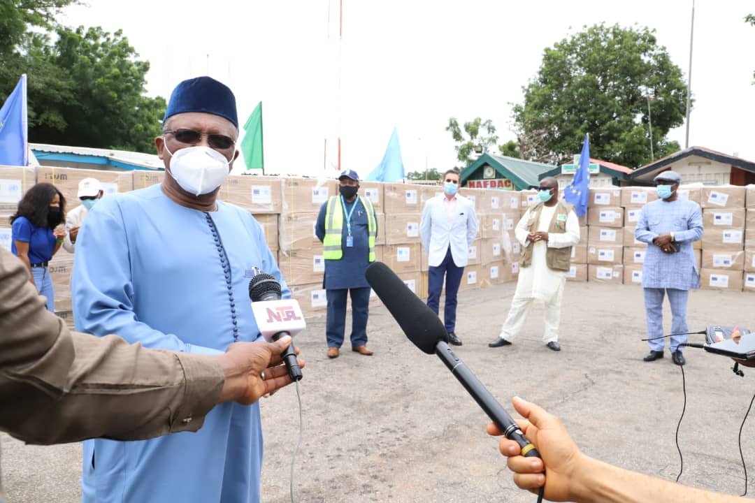 The Minister jointly received the medical supplies with the National Coordinator of Presidential Task Force on COVID-19, Dr. Sani Aliyu at the Cargo Section of Nnamdi Azikwe International Airport, Abuja from EU contributions.