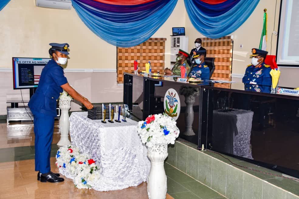 Squadron Leader Martin Egwurube clinched the Commandant’s Award for the Best Research Paper as well as the Best Graduating Student’s Award, while Flying Officers Joseph Agada and Lawal Ismail received awards for emerging second and third in order of Merit.
