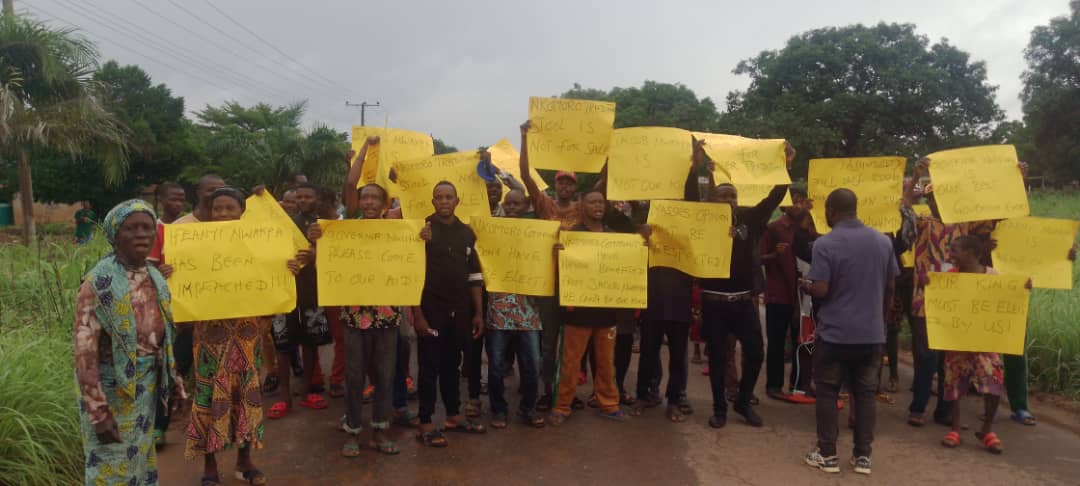 Members of the community defied heavy ran on Monday to express their displeasure with placards of different inscriptions boldly written: Nkomoro community have never benefited from Jacob Nwakpa!, Nkomoro traditional stool is not for sale, Jacob Nwakpa is not our Choice among others.