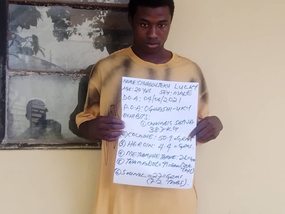 The previous day, Friday 4th June, operatives of the Delta State Command of the Agency arrested 20-year-old Chukwujeku Lucky at Ogwashi Uku, Delta State with multiple drugs weighing 38.90 kilograms.