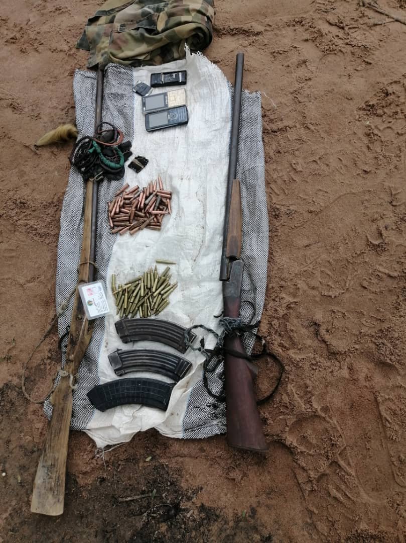 He said the items recovered include; 2 locally made rifles, 55 rounds of 5.56mm ammunition, 117 rounds of 7.62mm ammunition, 3 mobile phones, 3 AK 47 magazines, 2 motorcycles, one military shirt uniform, one Peace Corps ID Card belonging to one Mr Anyor Fidelis and some charms.